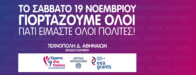 Το πρόγραμμα «Είμαστε όλοι Πολίτες» ολοκληρώνεται, έχοντας βελτιώσει τη ζωή περισσότερων από 240.000 ανθρώπων. Το γιορτάζουμε στην Τεχνόπολη, με μια μεγάλη γιορτή της κοινωνίας των πολιτών.